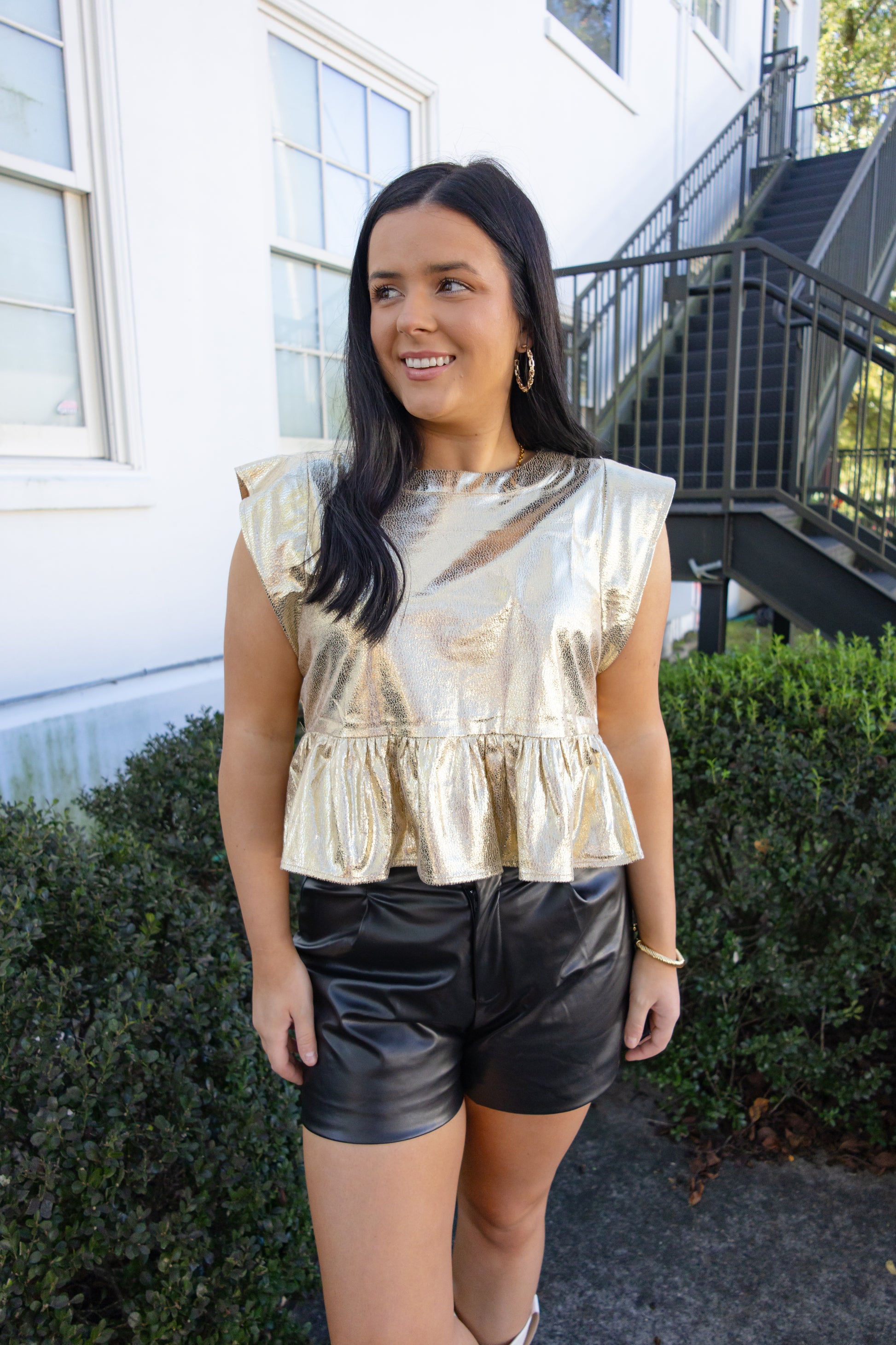 Shine bright during the holidays with this new top! This top features a ruffle hem and such a flattering fit with a button neck closure.