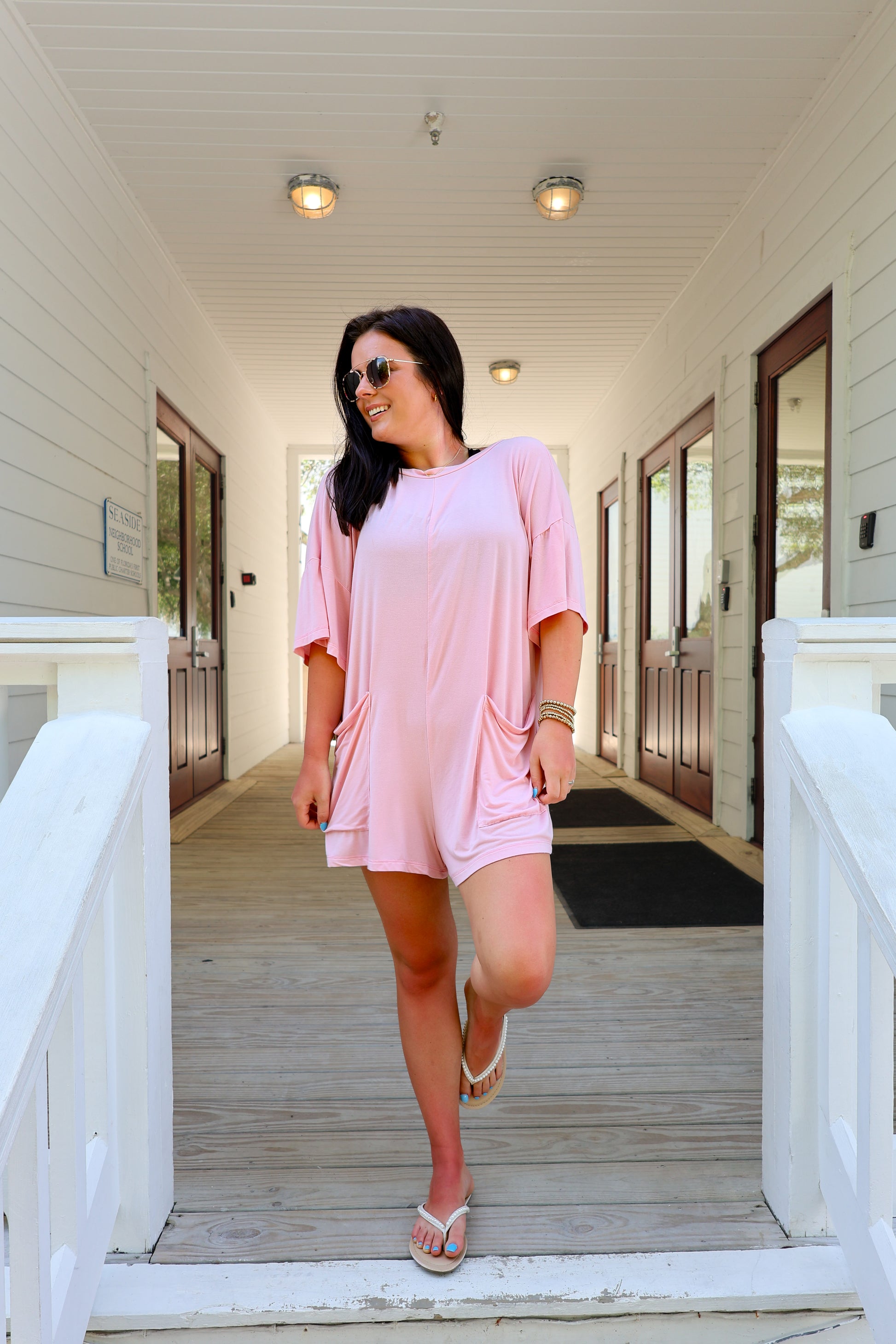 Such a fun oversized baby pink romper with a v neck back + it has POCKETS!! This material is SO soft you will want to wear this on REPEAT!