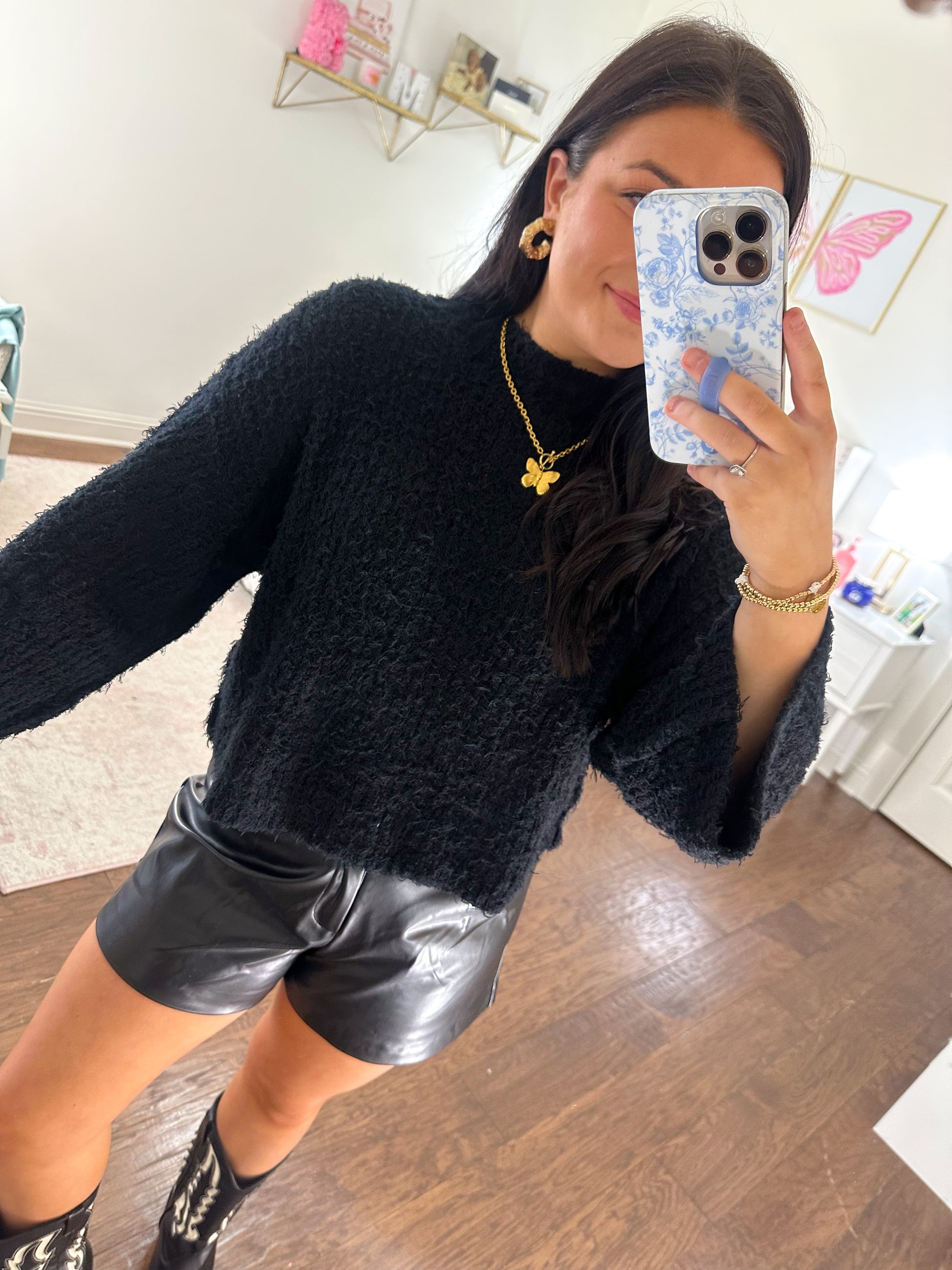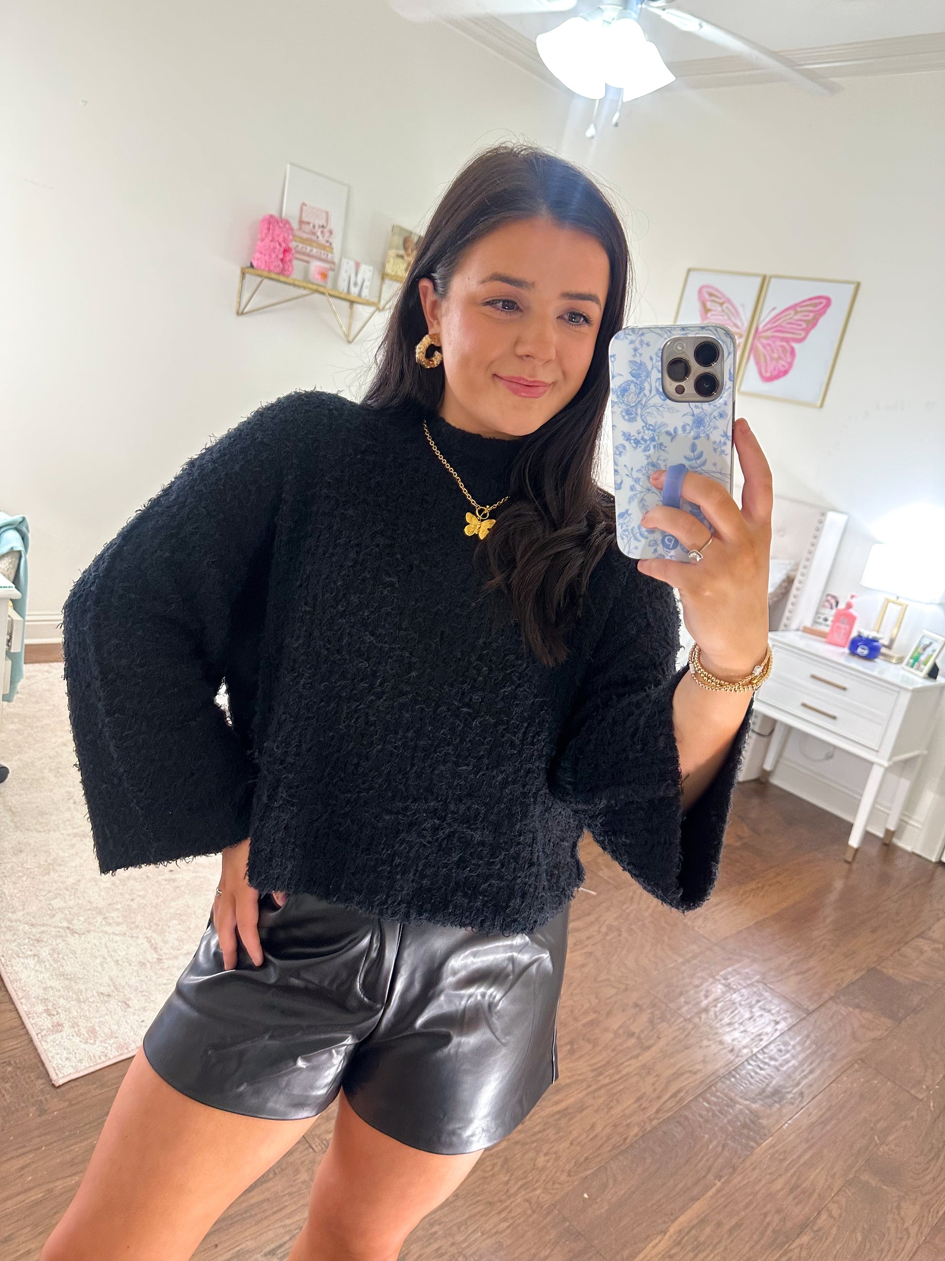 An essential black sweater that can be dressed up or down for any event! This sweater is so comfortable and flattering with the wide sleeves and mock neck details.